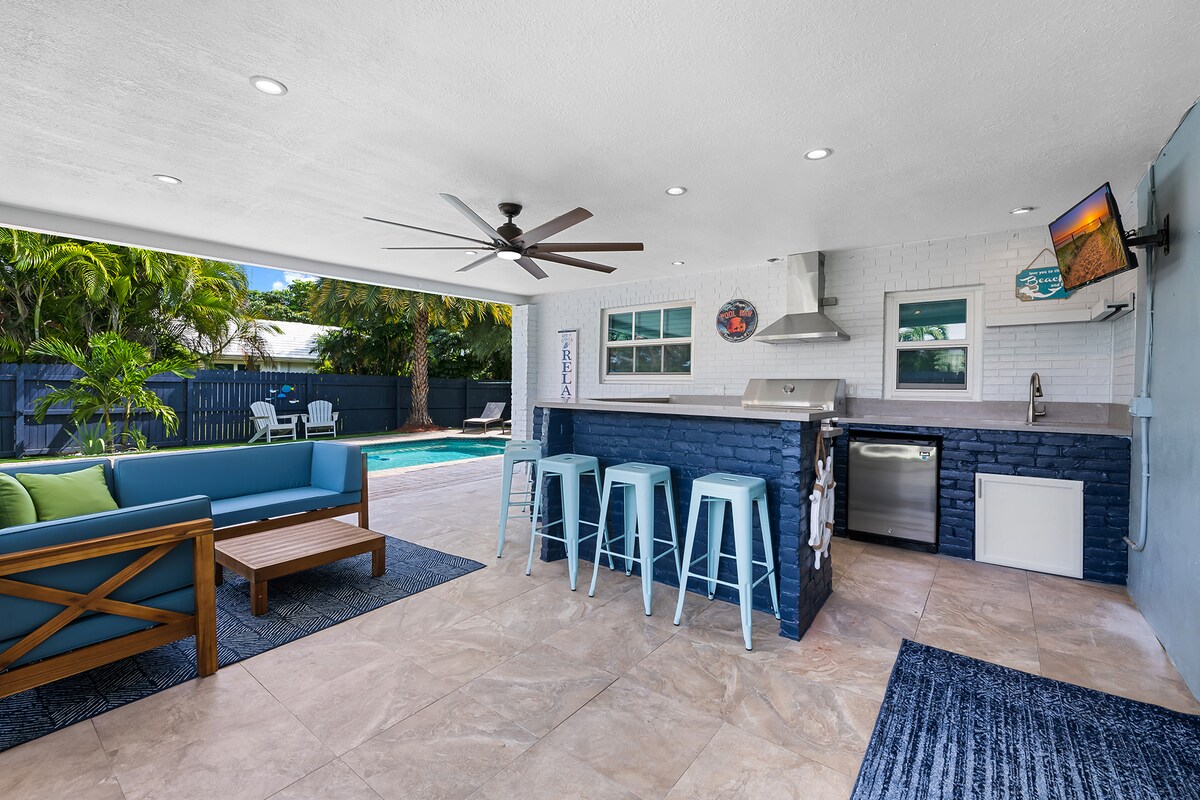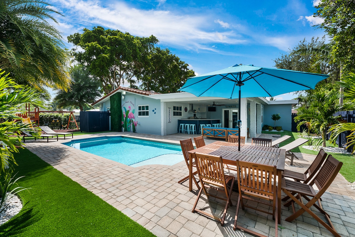 Dania BeachWelcome to your private oasis! JUST RENOVATED!! Beautifully landscaped backyard with HEATED amazing pool, soft pristine turf, & private PLAYGROUND! Outside is complete with kitchen/bar & lounge area perfect for grilling & hanging out & a beautiful flamingo mural for ig worthy photo ops! Pool table, arcade, & plenty of games. Truly a home away from home with enough activities to keep both adults and kids entertained! 5 min to beaches & FLL Airport! Walking distance to Dania Beach Marina & Casino.